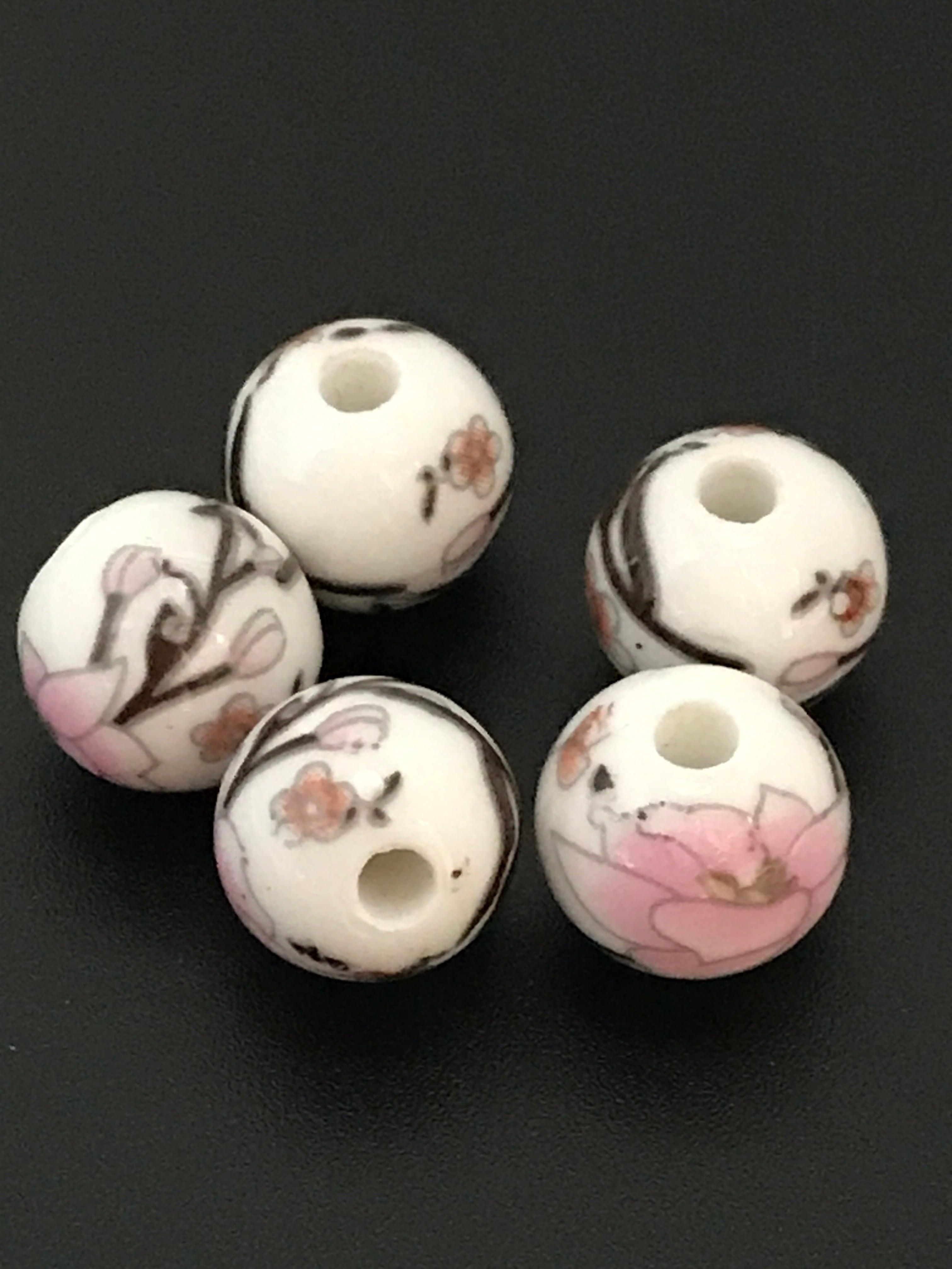 【526】花柄の磁器ビーズストランド★ブラック/ピンク 10mm/5個