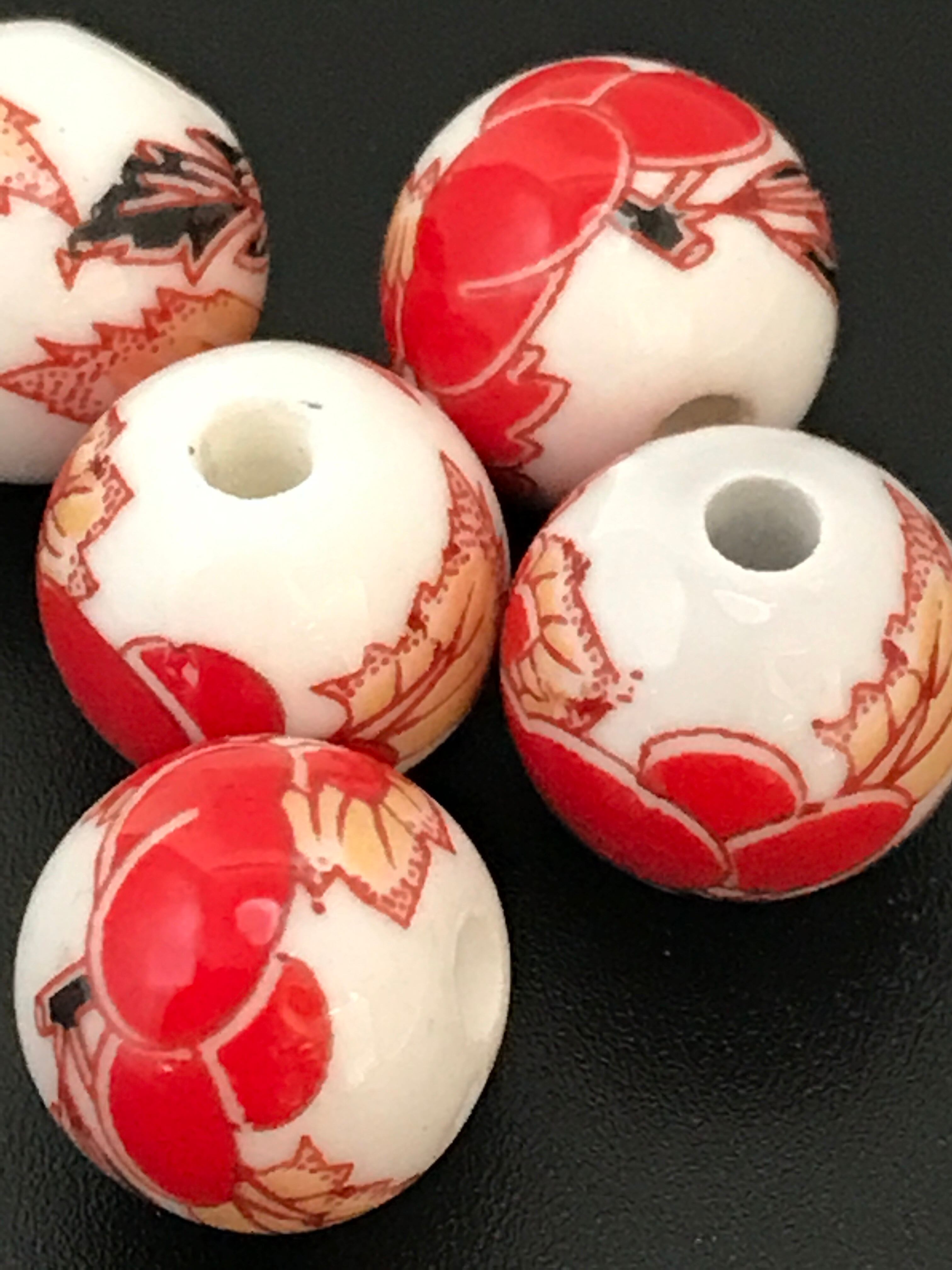 【529】花柄の磁器ビーズストランド★レッド 10mm/5個